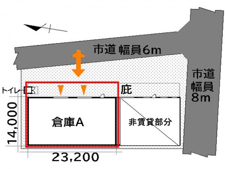 | 物件詳細 | ■敷地:345.76坪(1,143.01㎡)(隣地共用) ■天井高:6.0m ■前面道路:6m ■シャッター:幅3.9m×高さ4.9m ■希少 平屋倉庫 ■中途解約違約金 アリ |