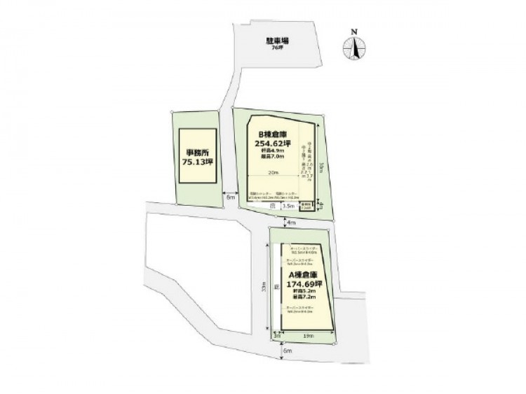 | 物件詳細 | 倉庫A棟約174.69坪 倉庫B棟約254.62坪 事務所約75.13坪 |