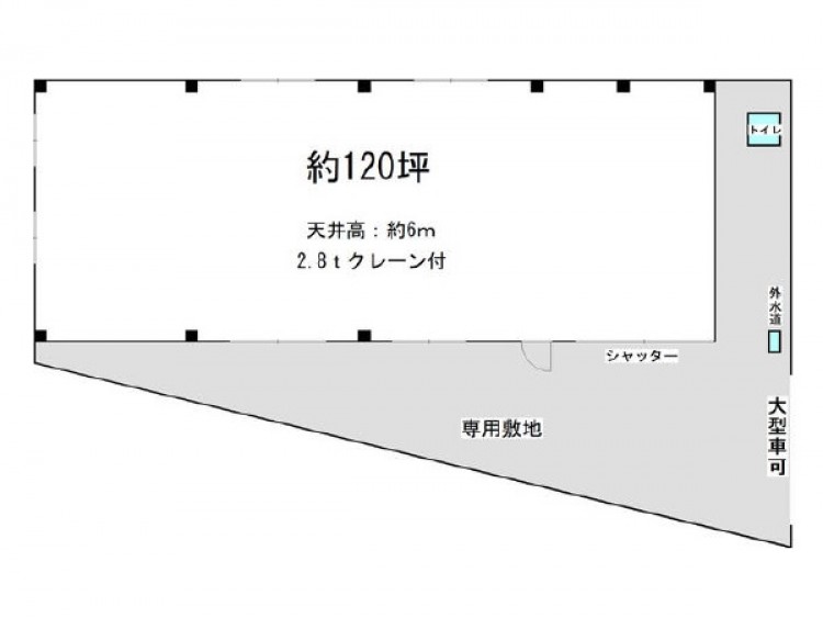 物件詳細 | 2.8tクレーン有(残置物、動作未確認) 動力・シャッター・汲み取り式トイレ・外水道あり 天井高約6m |