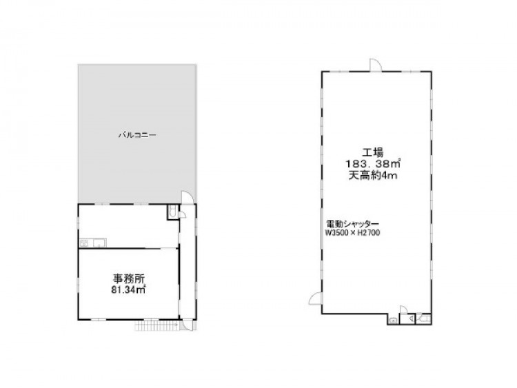 | 物件詳細 | 1階:約183.38㎡、2階:約81.34㎡ 1階天井高:3.97m シャッター高さ2.7m、幅3.5m |