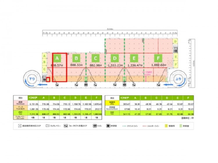 物件詳細 | ■倉庫4階A区画670.82坪/4階荷受け事務所10.41坪 ■床荷重1.5t/㎡ ■4階天井高5.5m ■倉庫内にシーリング・ファンを設置 ■各階接車バース付き、平屋使い可能倉庫 ■八千代中央駅より直通リムジンバス運行 ■従業員向けに、無人コンビニ、食堂完備 |