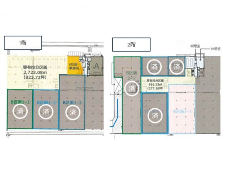 | 物件詳細 | ■床荷重:1.5t/㎡ ■貨物リフト3.5t(別途:垂直搬送機あり) ■大型トラック荷下ろし可能 ■1階共用のトラックバースあり ■仕切りはメッシュフェンス ■使用面積詳細 専有部:1742.35㎡(527.06坪) 共有部:659.83㎡(199.6坪) 合計:2402.18㎡(726.66坪) |