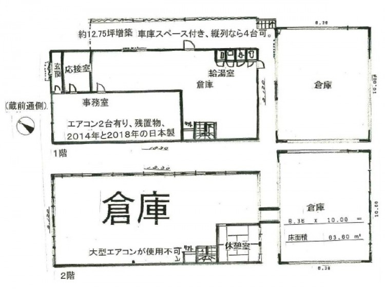 | 物件詳細 | 建物(蔵前通側)/1階約148.59㎡、2階約148.59㎡ 昭和55年築 建物(奥側)/1階約63.60㎡、2階約63.60㎡ 昭和58年築 |