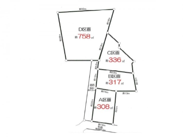 | 物件詳細 | A区画:約308㎡、月額200,000円 B区画:約317㎡、月額200,000円 C区画:約336㎡、月額200,000円 D区画:約758㎡、月額400,000円 建築不可(確認申請要するもの) |