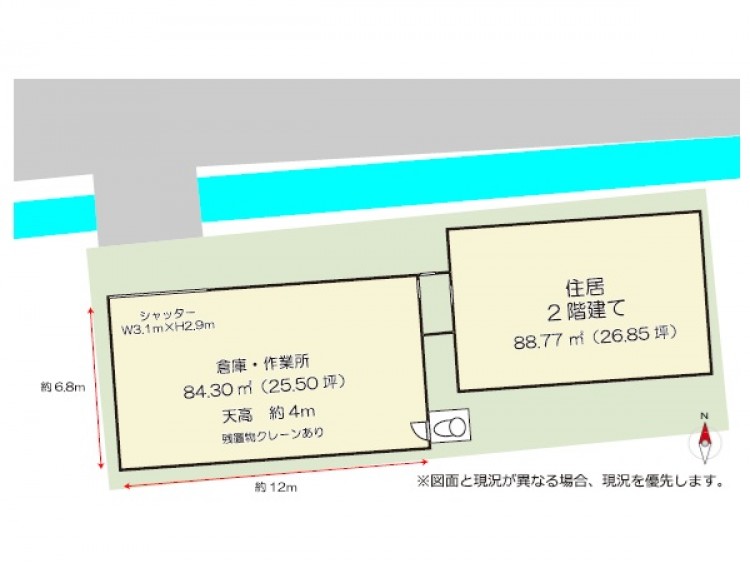 | 物件詳細 | 木造2階建(住居) 1階:約58.79㎡、2階:約29.98㎡ 鉄骨造平屋建(作業所):約84.30㎡ |