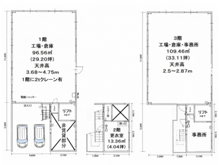 | 物件詳細 | 1階約96.56㎡、2階約13.36㎡、3階約109.46㎡ |
