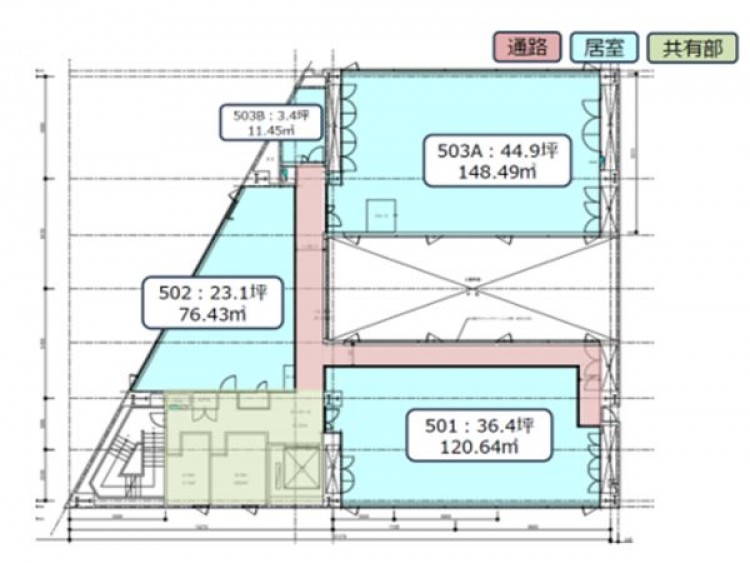 | 物件詳細 | ■EV30人乗り1基 ■共用荷捌き場あり ■床荷重500kg ■賃料:坪17,000円・共益費坪1,000円 |