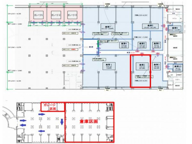 | 物件詳細 | *67.5坪の他185坪・84坪・40坪・25坪・14坪など区画あり *倉庫前まで自走可能 *ガレージ区画あり (1スパン32坪・192,000円税別) *低床倉庫 *トイレ(共用) |