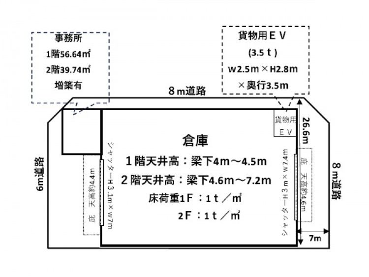 | 物件詳細 | 倉庫面積 1階:約983.28㎡、2階:約983.28㎡ 事務所面積 1階:約56.64㎡、2階:約39.74㎡ |